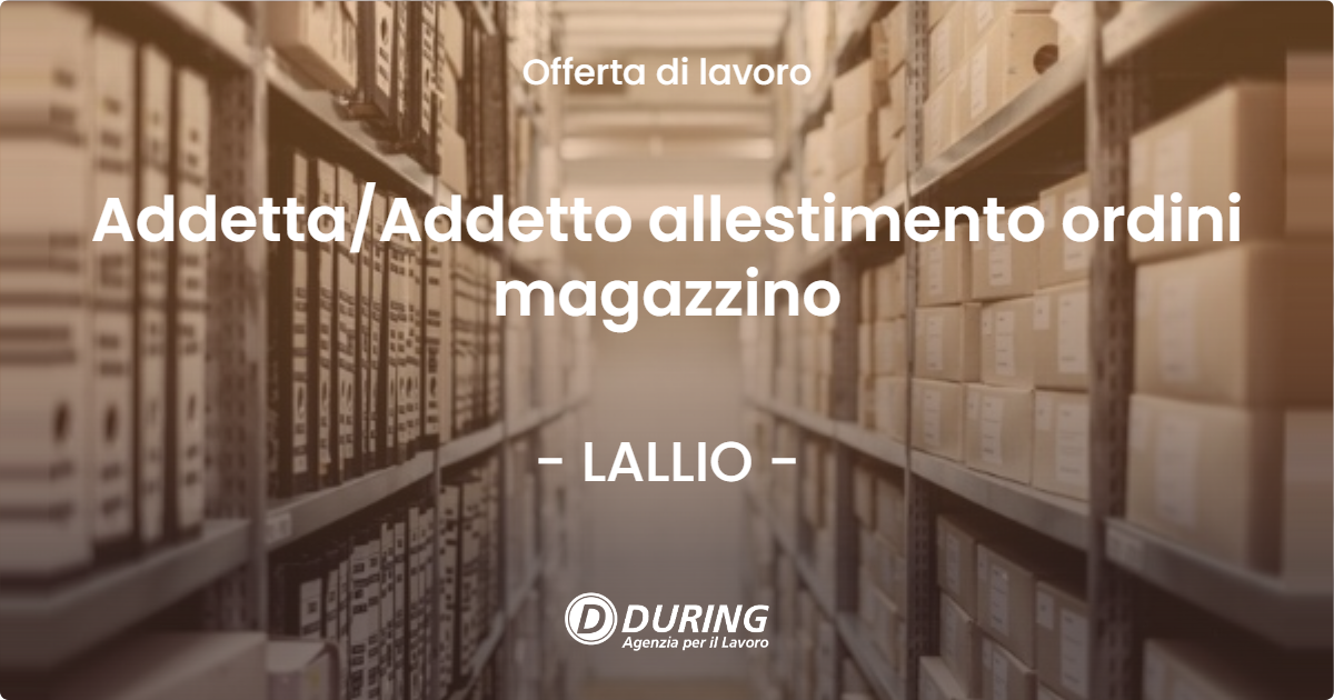 Azienda operante nella gestione di magazzini farmaceutici ricerca una Allestitrice/Allestitore ordini da inserire presso la sede di Lallio.Orario di lavoro: Full Time, dal lunedì al sabato, con turni distribuiti come segue:Lunedì – Venerdì: