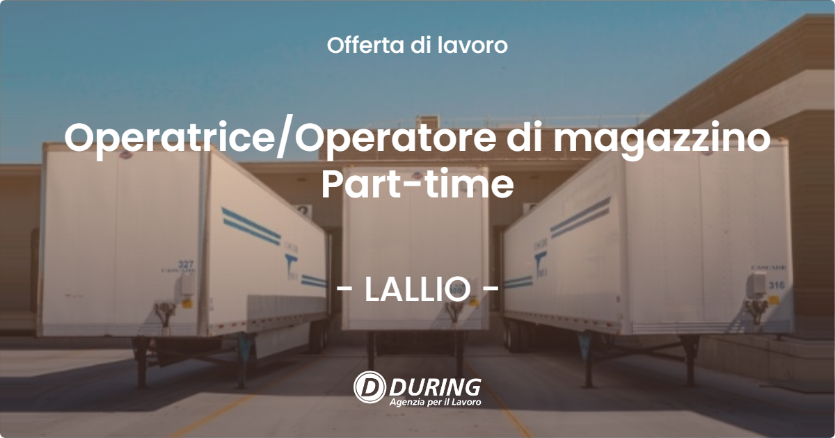During SpA ricerca un/una ADDETTO/ADDETTA ALLE PULIZIELa risorsa selezionata dovrà occuparsi della pulizia di uffici e locali commercialiLuogo di lavoro: LALLIO (BG)Orario di lavoro: 15 h settimanali. Dal LUN al VEN, o dalle ore 13.30 alle